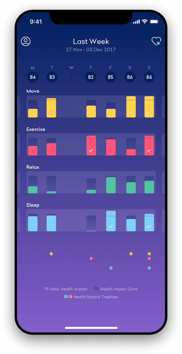 To generate sustainable outcomes for better personal health, we visualize a user’s movement, exercise, relaxation and sleep on different time scales: daily, weekly, and monthly. These three views foster an understanding of a user’s current health status as well as the long term impact of habits and behaviours.