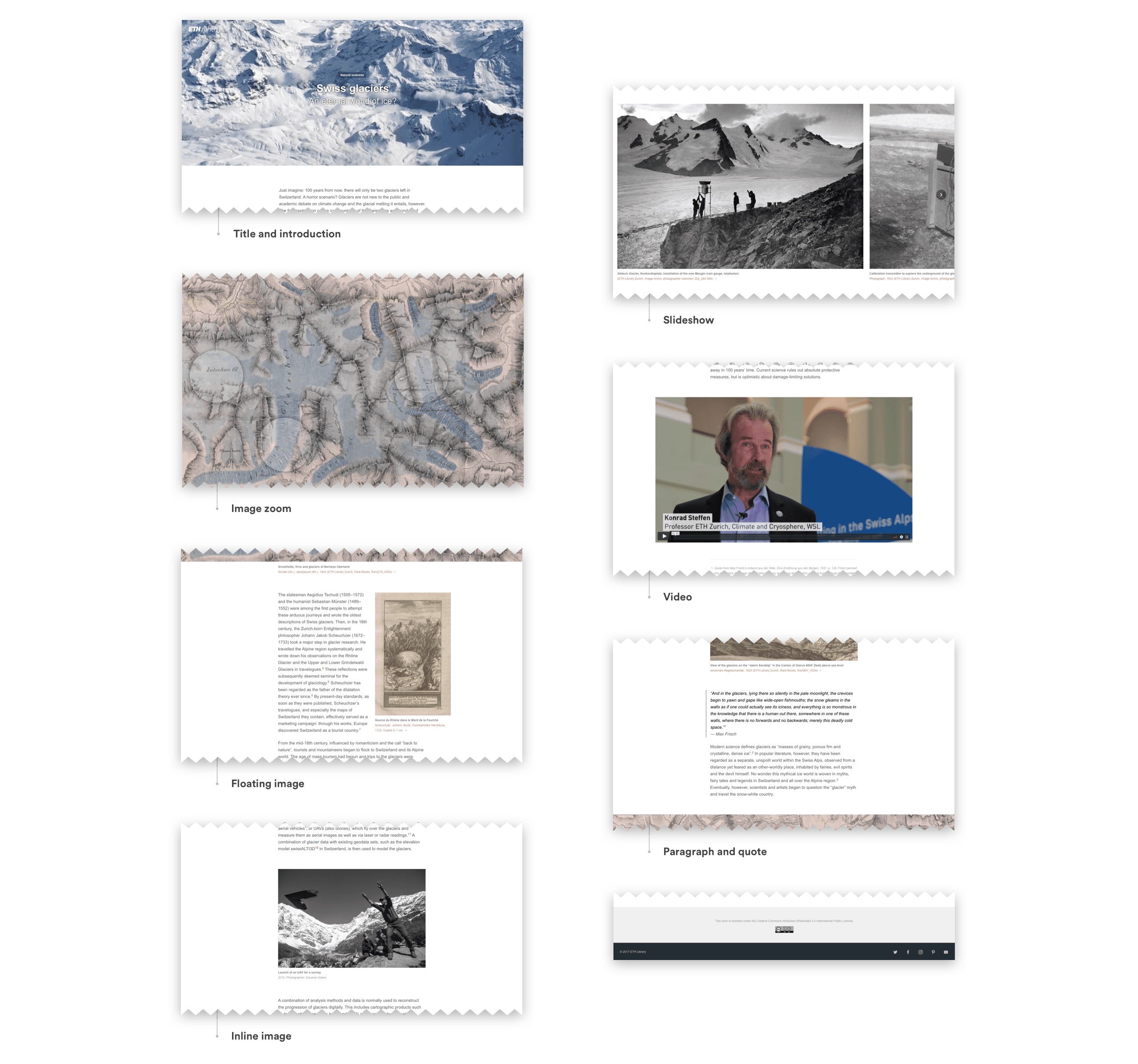 Knowledge has to be shared to have value for society and it is best shared through storytelling. To reflect this, contents of ETH Library spanning collections and archives are recombined and presented on Explora as informative stories. Each story includes videos, slideshows and high-quality photos of rare books and prints. The built in zoom functionality allows users to see the library's gems in their full beauty.