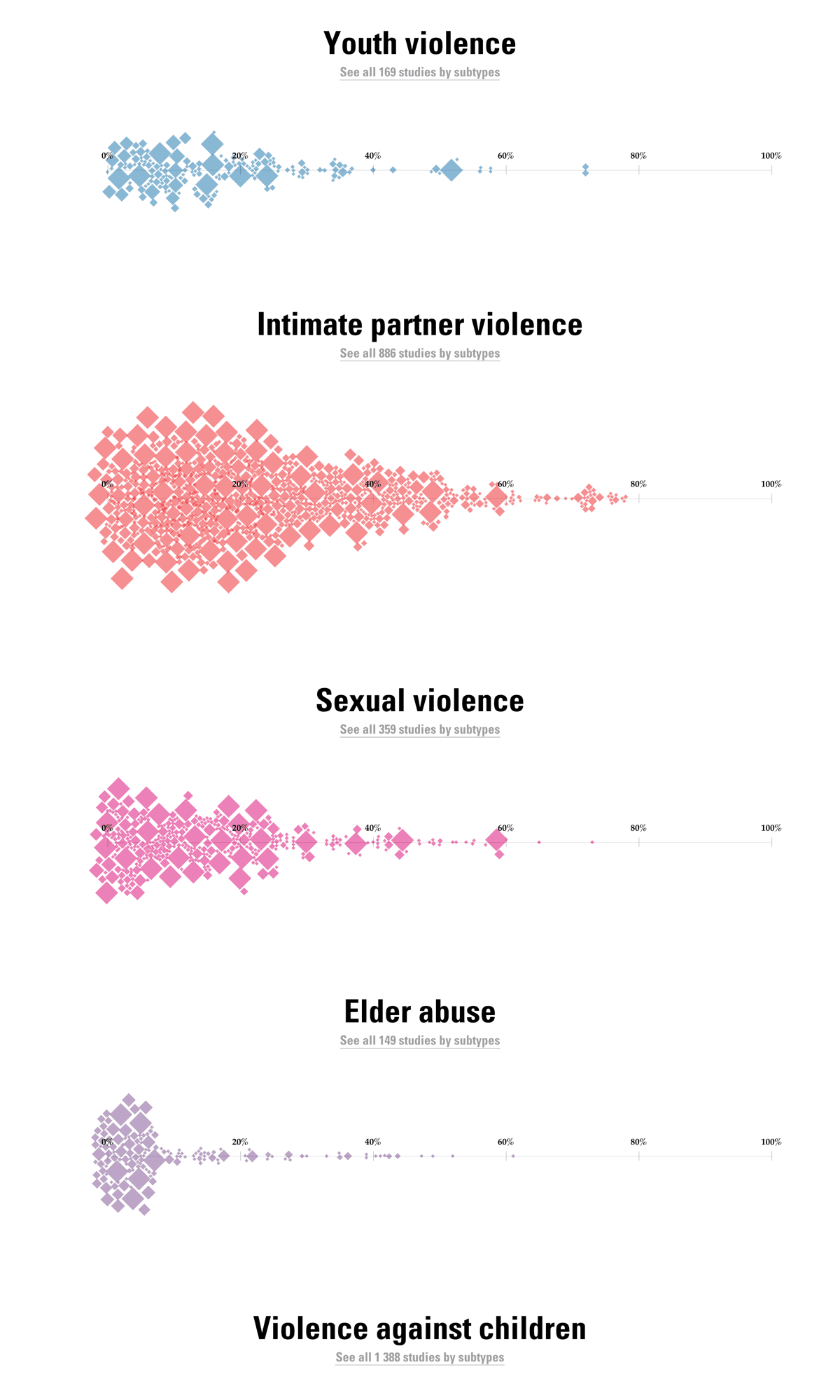 For each of the violence types we created a dedicated page to summarize the most important facts and figures. It is structured to first give a solid definition and explanation of a violence type’s prevalence. The experience then continues into the potential consequences and risk factors for an individual and our greater society. Each category is concluded with a list of possible prevention and response strategies based on the findings of multiple studies within the database.